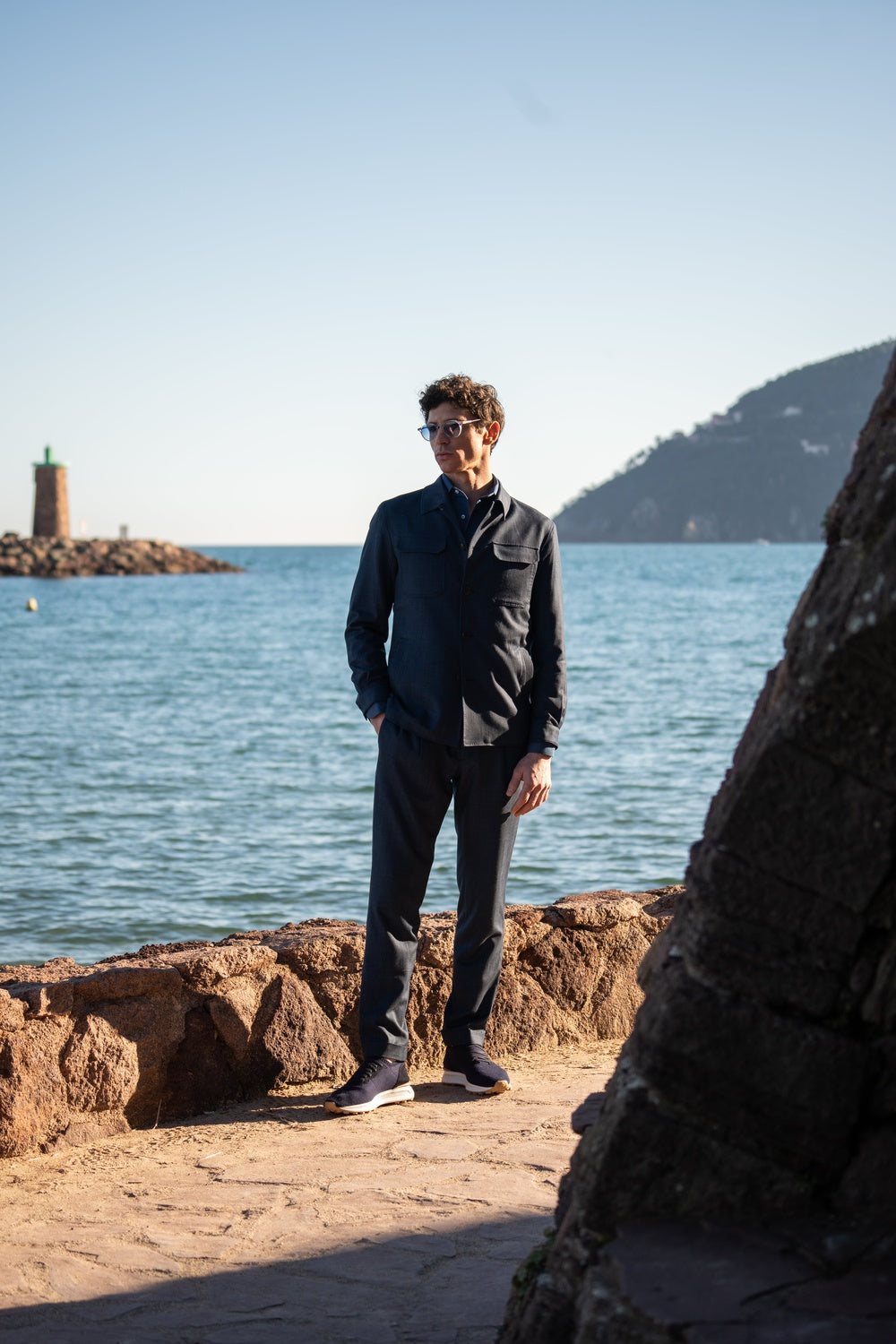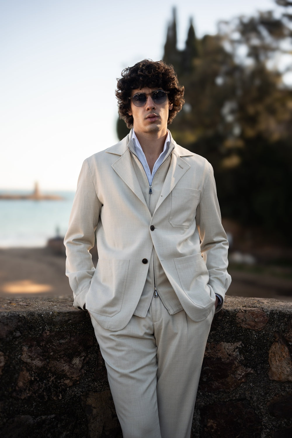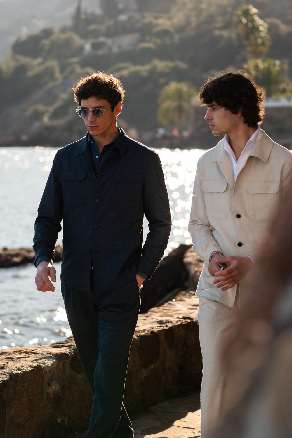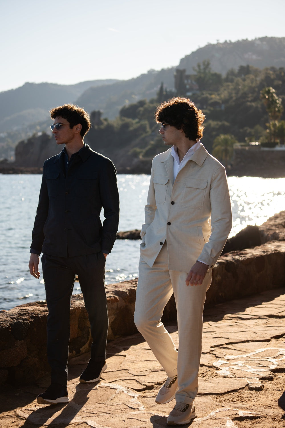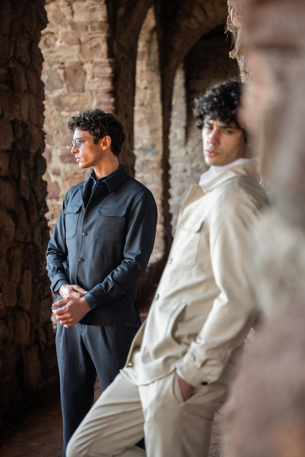 A clever duet of Merino wool and wool-linen-silk-blend jersey captures the season’s essence, soft to the touch, bold in character.